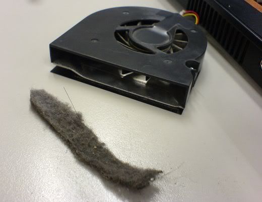 話說公司的筆電這陣子越來越燒, 除了轟隆隆的風扇聲之外, 整台電腦從底座到鍵盤都呈現熱力四射的狀態… 之前天氣冷用起來是挺舒服的啦, 最近變熱後一整個燙燙燙燙燙… 由於一直約不到風扇部門的同事來幫看, 於是…今天我終於受不了的自己來拆啦!!! (我知道不難啦,只是沒拆過總是有點怕怕的…) 於是拆完之後… 相片中那條帶子絕對不是空氣濾網更不是隔音泡棉…!!! 而是緊密厚實的積塵阿~!!!(整個擋在出風口|||) 清完之後風扇不吵了,電腦也不燙了~ 心情一整個爽啦~~~